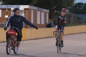 B derny major final – winner Alex Jones, Sigma Sport, paced by John Wann — B derny major final – winner Alex Jones, Sigma Sport, paced by John Wann